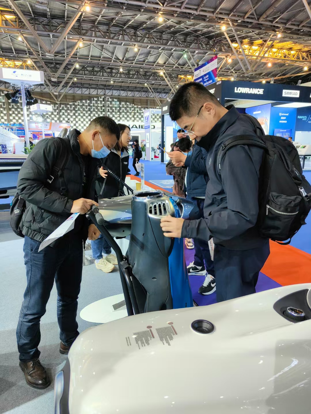 展会期间,我司展台人气爆棚,路亚艇和电动潜水推进器成为全场焦点。其中,SEABOB潜水推进器凭借其外观设计吸引了众多参展观众驻足,作为一台水上推进器,其速度和最大下潜深度受到咨询者的普遍认可,以其“强劲动力、高效运行”的特点,赢得一致好评。多位参展观众表现出了浓厚兴趣,部分在现场已达成采购意向。